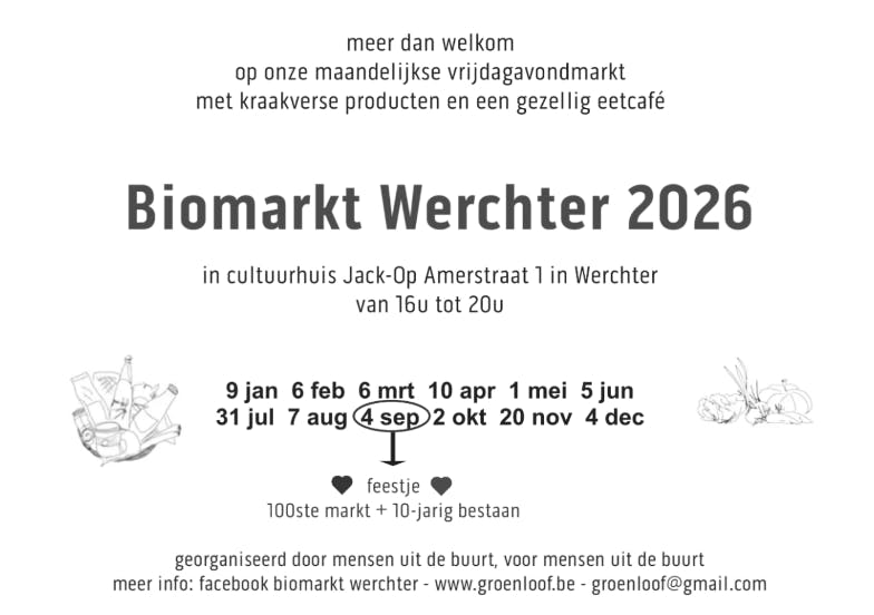 Iedereen heel welkom op onze avond(bio)markt. Ontdek ons aanbod van groenten, kazen, broden, fruit, sap, verfijnd gebak, confituren, honing, zero-waste producten, granola's en noem maar op! Blijf gerust plakken in ons marktcafé. Je kan er terecht voor pizza, een dagschotel en/of een drankje. Steeds gezelligheid troef!