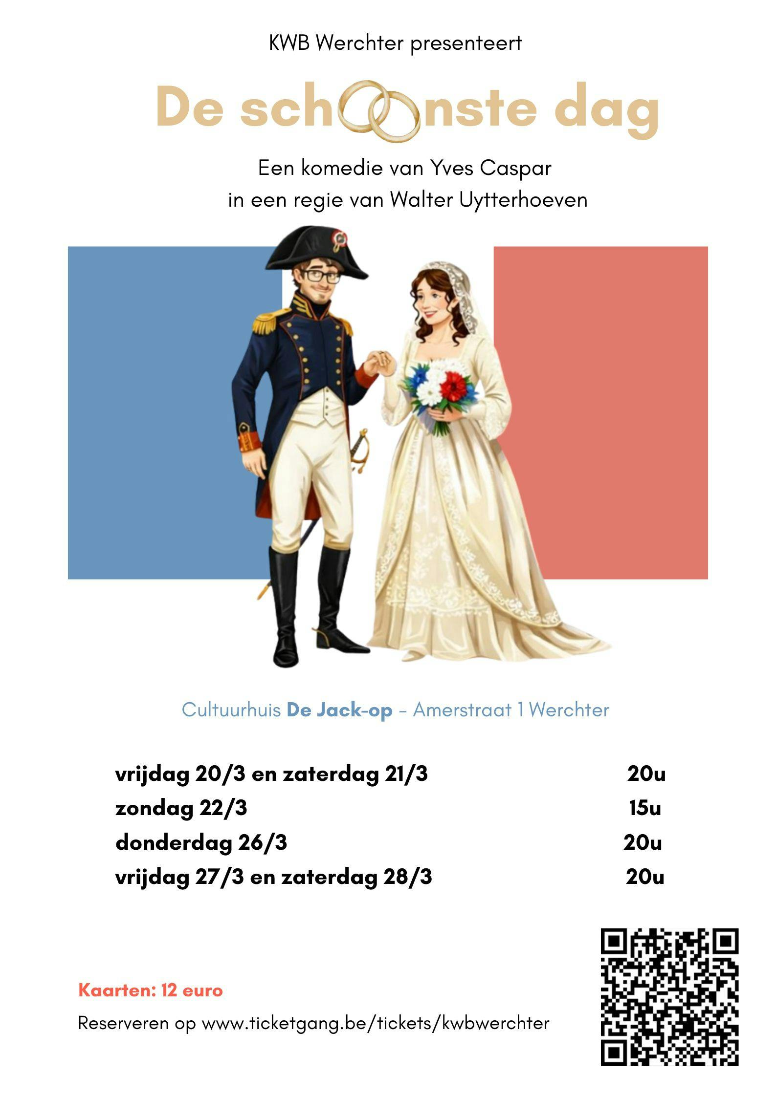 "De Schoonste Dag" is een populaire Vlaamse komedie van auteur Yves Caspar, gespeeld door diverse amateur-toneelkringen, over een cynische zoon (Alex) die verrast wordt wanneer zijn vader (Lucien) plotseling wil trouwen met een veel jongere vrouw (Sybille) die hij online ontmoette, wat leidt tot chaotische huwelijksvoorbereidingen met excentrieke hulp van een weddingplanner en een priester. De theatervoorstelling is een humoristische kijk op familierelaties en de chaos van een trouwfeest, vol onverwachte wendingen. KWB Toneel Werchter brengt voor u dit stuk in een regie van Walter Uytterhoeven.