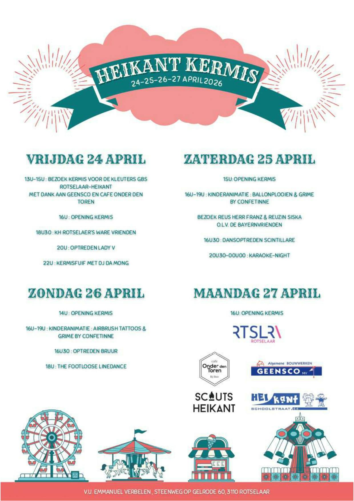 Het is kermis in Rotselaar-Heikant van vrijdag 24 april tot en met maandag 27 april. Een jaarlijks moment om naar uit te kijken, met de gezellige drukte en de diverse activiteiten in het centrum van Heikant.