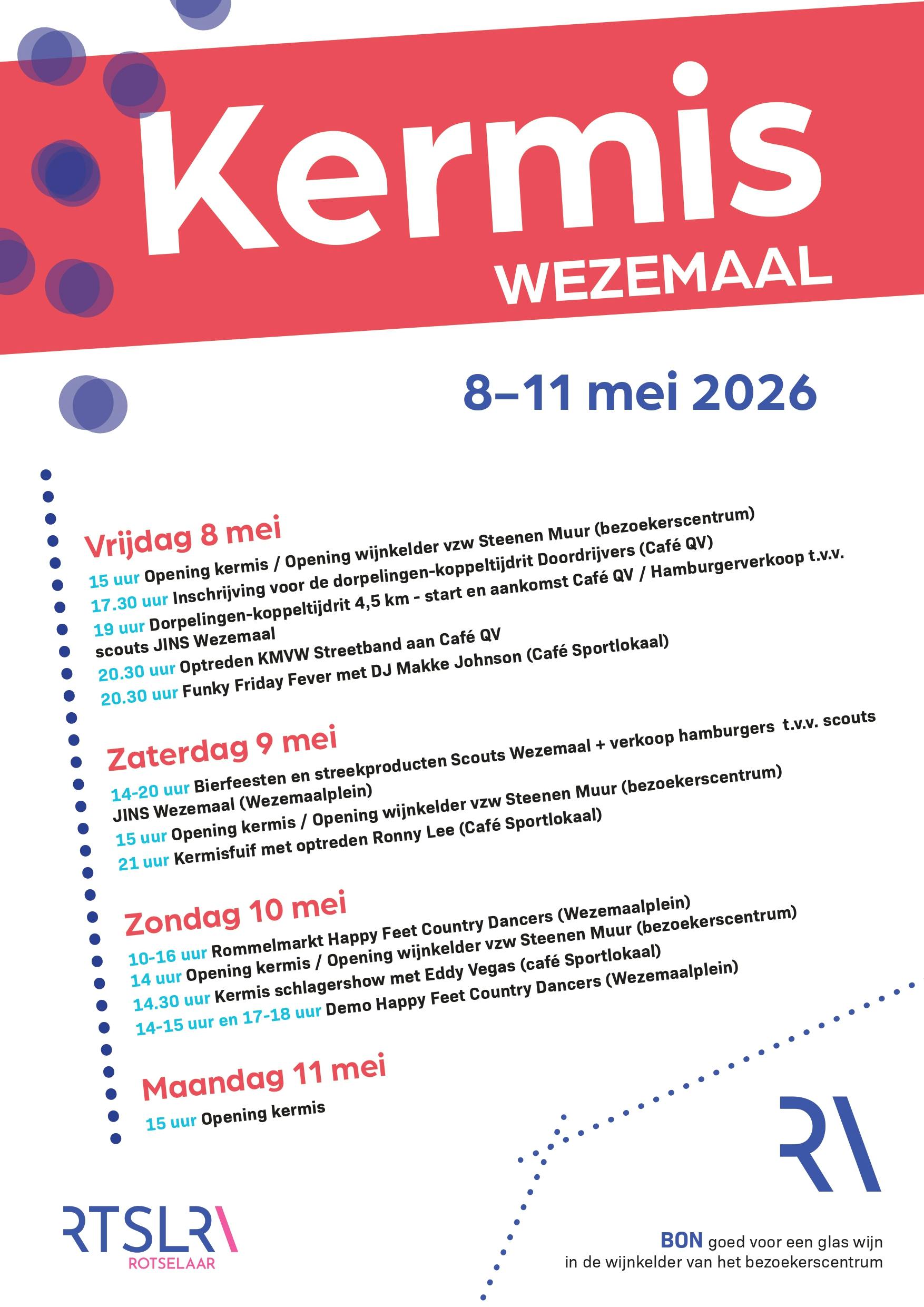 Van vrijdag 8 tot en met maandag 11 mei belooft het in Wezemaal een feestelijk weekend te worden, waar we samen naar uitkijken. Zo ontvangt het dorp de kermis en staan er daarnaast nog tal van andere activiteiten op het programma.