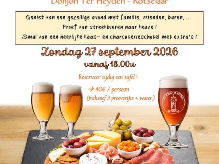 Een gezellige bieravond ... ... met vrienden, familie of buren ... en smullen van een heerlijke kaas- en charcuterie schotel ​ Geniet van een gezellige avond met familie, vrienden, buren, … Proef van streekbieren naar keuze ! Smul van een heerlijke kaas- en charcuterieschotel met extra’s ! ​Er is voor elke tafel water voorzien en er zijn 3 bierproevertjes naar keuze inbegrepen. Zondag 27 september 2026​​ ​​ Welkom vanaf 18.00u en we sluiten de deuren om 22.30u. Dit laat jullie dus de tijd om nog van extra streekbiertjes te genieten tegen vriendelijke prijzen en in proefglaasjes van 15cl. ​​