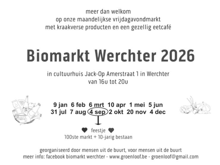 Iedereen heel welkom op onze avond(bio)markt. Ontdek ons aanbod van groenten, kazen, broden, fruit, sap, verfijnd gebak, confituren, honing, zero-waste producten, granola's en noem maar op! Blijf gerust plakken in ons marktcafé. Je kan er terecht voor pizza, een dagschotel en/of een drankje. Steeds gezelligheid troef! Locatie: Jack-op Amerstraat 1 in Werchter Wat schaft de pot? -dagschotel met groenten recht van het veld door de plek bestellen kan via