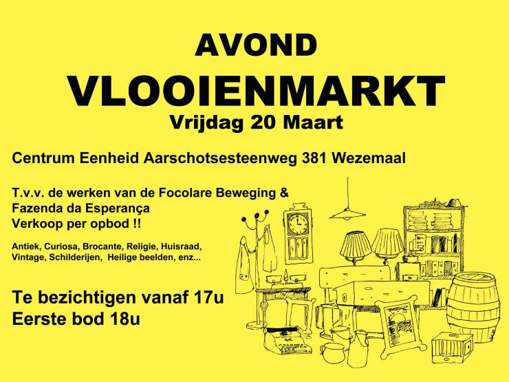 Avond Vlooiemarkt ! Verkoop per opbod !! ongeveer 150 loten die ons worden geschonken door sympathisanten Antiek - curiosa - brocante - huisraad - religie - schilderijen - enz ... T.V.V. Focolare Beweging & Fazenda da Esperanqa inkom 1 euro Van harte welkom !