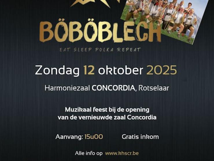 Feestelijke opening van de vernieuwde harmoniezaal Concordia! BöBöBlech, een 14-koppige, authentieke blaaskapel zorgt voor een spetterend optreden. Kom samen met ons genieten van deze bijzondere mijlpaal. Iedereen welkom – jong, oud en alles daartussen! Inkom Gratis!
