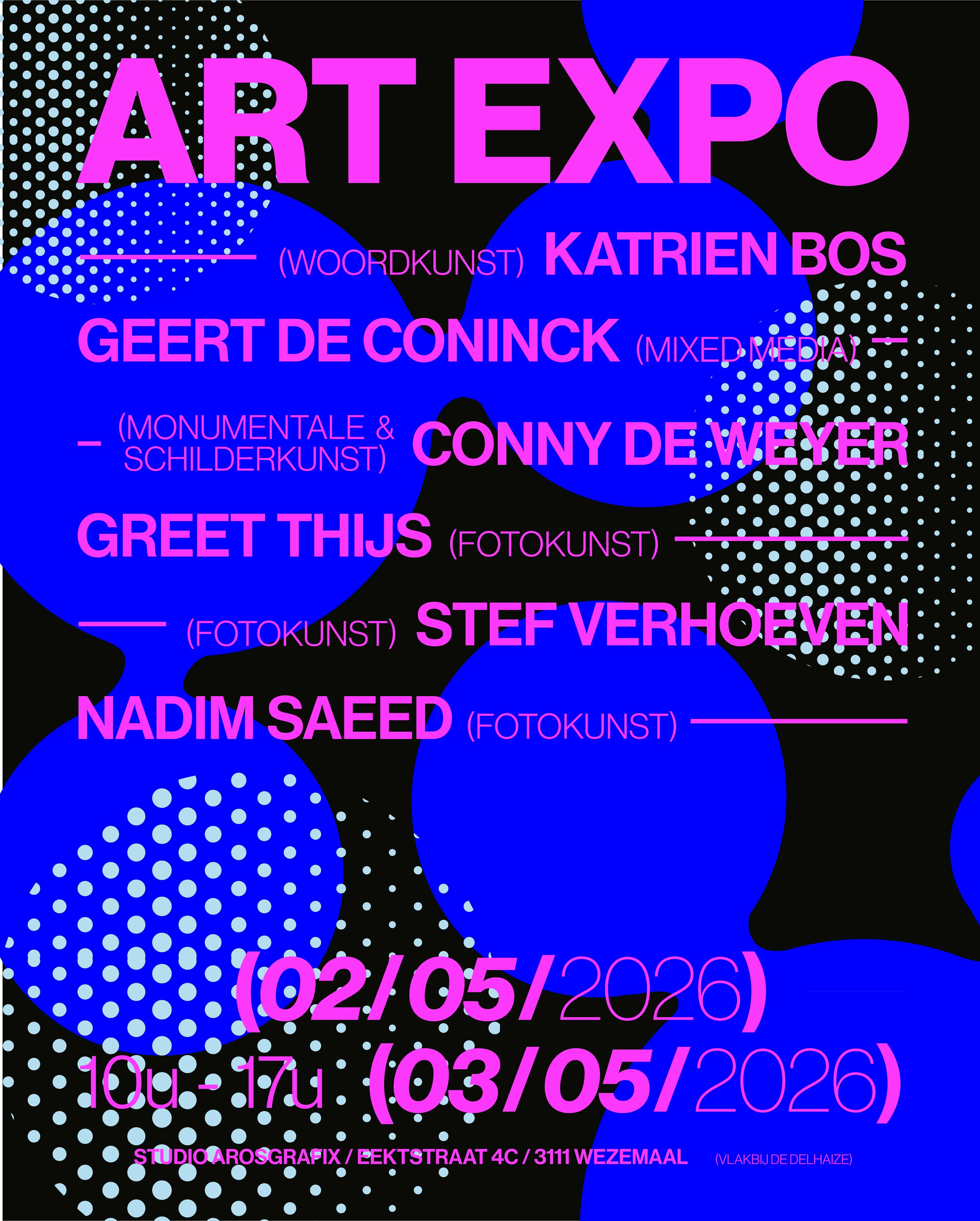Art Expo in de studio van Argosgrafix met werk van Katrien Bos (woordkunst), Geert De Coninck (mixed media), Conny De Weyer (monumentale & schilderkunst), Greet Thijs (fotokunst), Stef Verhoeven (fotokunst) en Nadim Saeed (fotokunst).