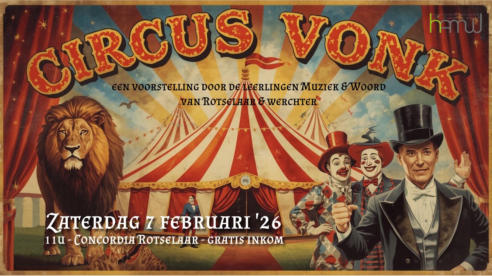 voorstelling "Circus Vonk" door de leerlingen van de Hagelandse academie voor Muziek en Woord van Rotselaar en WerchterHarmoniezaal Concordia - 11u - Gratis toegang.