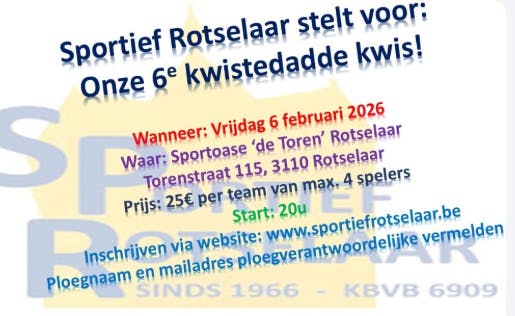 Gezelligheid gegarandeerd tijdens onze 6e Kwistjedatte quiz op 6 februari!Prijzen voor alle deelnemende teams. Teams van max 4 personen.