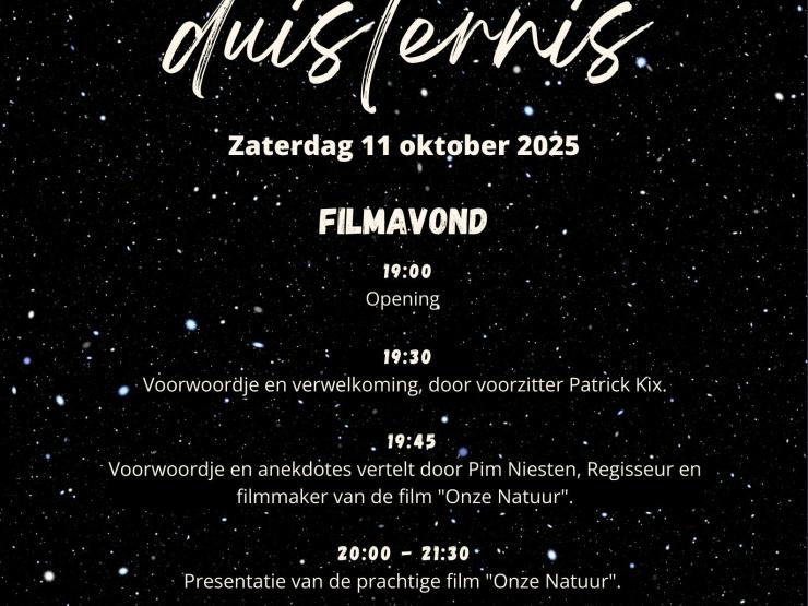 Op zaterdag 11 oktober 2025 organiseren wij ons derde evenement voor "De Nacht van de Duisternis". Het programma voor 2025 ziet er als volgt uit: 19:00 uur: Opening, met de mogelijkheid om te genieten van onze pannenkoeken, pompoensoep, koffie of een drankje. Deze zijn doorlopend beschikbaar. Alles tegen democratische (steun)prijzen. 19:30 uur: Voorwoordje en verwelkoming door de voorzitter van Avalon, Patrick Kix.