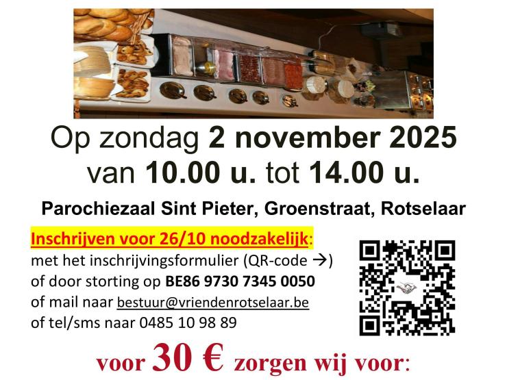 Uitgebreid Hagelands Brunch-Buffet van de vzw V.R.I.E.N.D.E.N. Inschrijven noodzakelijk. Wij zorgen voor : een glas schuimwijn of fruitsap - Koud buffet : Charcuterie: gedroogde ham / klassieke hesp / kippenwit / kipkap - Kaas: jonge gouda / maredsous / brie / camembert - Zoet beleg: konfituur & choco in Kleine porties - Warm buffet : Witte & zwarte pensen met verse appelmoes / Ontbijtspek & roerei / Gekookte eitjes / Verse kervelsoep met boursin – Dessertenbuffet : Pannenkoeken met diverse soorten suiker / Verse chocomousse / Rijstpap met suiker - Verse pistolets / sandwiches / wit brood /