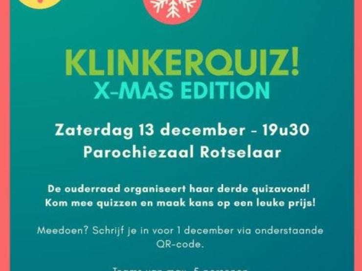 🎉 KLINKERQUIZ 2025 🎉 Yes! Ook dit jaar strijden de slimste geesten opnieuw tegen elkaar in een spannende quizavond. 📅 13 december 2025 🕢 Deuren open om 19u30 – quiz start om 20u 📍 Parochiezaal Sint-Pieter, Groenstraat 19, Rotselaar 💶 Prijs per deelnemende ploeg 👥 Een quizploeg telt tussen de 3 en 5 leden 💡 Inschrijvingen starten 10/10/2025, via de QR code van de flyer in de afbeelding. Bereid je voor op een gezellige, bloedstollende strijd waar kennis, humor en teamwork centraal staan. Ouders, leraren, medewerkers en sympathisanten nemen het tegen elkaar op voor eeuwige roem én een paar leuke