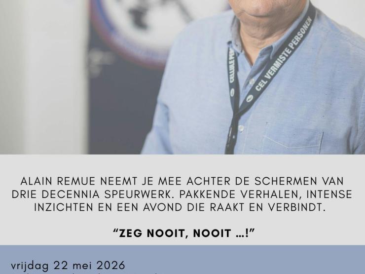 30 jaar lang stond Alain Remue aan het hoofd van de Cel Vermiste Personen, een dienst die werkt op de grens van hoop en wanhoop. In deze unieke lezing neemt hij je mee achter de schermen van één van de meest intense en mensgerichte opdrachten binnen onze samenleving. Met pakkende verhalen, inzichten uit drie decennia ervaring en een blik op wat hem drijft, biedt Alain een avond die raakt, verbindt en blijft nazinderen. Een uitzonderlijke kans om te luisteren naar iemand die elke dag het verschil probeert te maken voor families in het donkerste moment van hun leven. Nu hij met pensioen gaat wil